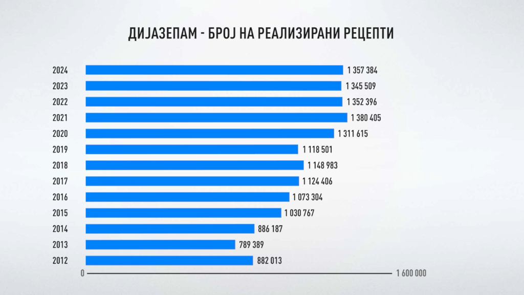 За илустрација, во 2012 се реализирани вкупно 1,6 милиони рецепти за анксиолитици, а во 2024 година, за Диазепам, Хелекс и Лексилиум, вкупно 2,4 милиони рецепти. Ако оваа бројка се спореди со официјалното резидентно население, излегува дека преклани, во просек, се издавале 1,3 рецепти за анксиолитици годишно по жител. Оваа бројка веројатно е поголема бидејќи јавно ги имаме податоците само за т.н. бели рецепти, а не и за т.н. розеви со кои лекот се купува на приватно и за лековите кои се „пуштаат“ под рака, без никаков рецепт.