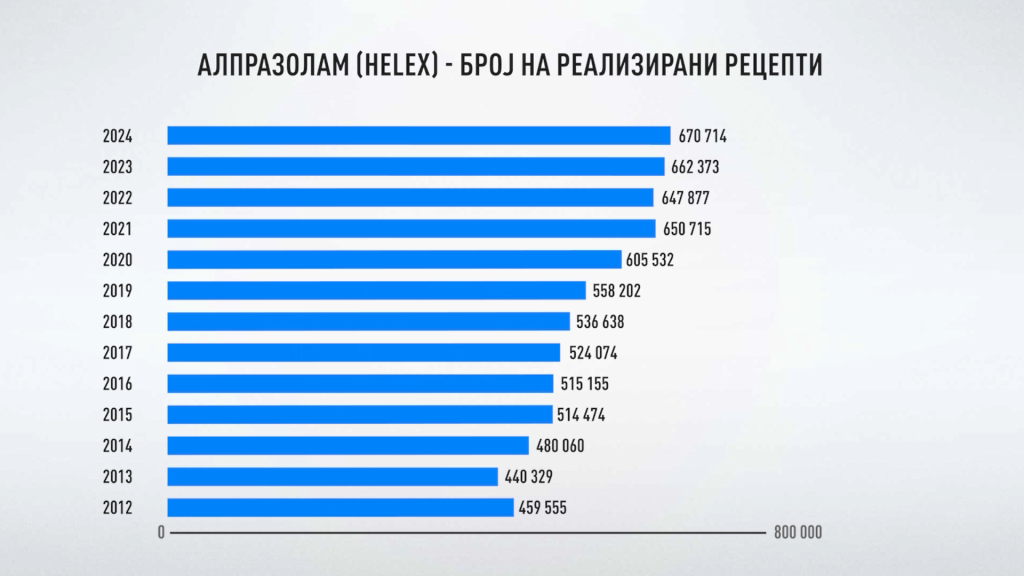 Во 2012 година биле реализирани 1,6 милиони рецепти за анксиолитици. Во 2024 г., последната година за која Фондот за здравствено осигурување има објавено податоци, биле реализирани 2,4 милиони рецепти за истата група на лекови