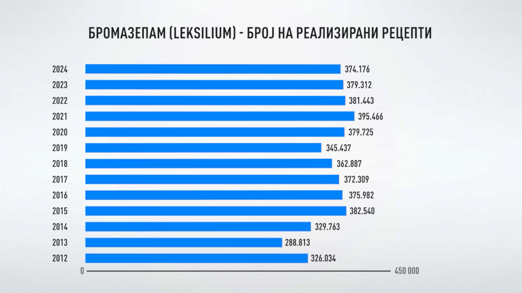 Бромазепамот, односно Лексилиум, во 2012 година бележи 326 илјади издадени рецепти. Расте на 382 илјади во 2015 година. Во 2018 изнесува 362 илјади. Пикот го достигнува во 2021 година со 395 илјади, додека податоците за 2024 година покажуваат реализација на 374 илјади рецепти.