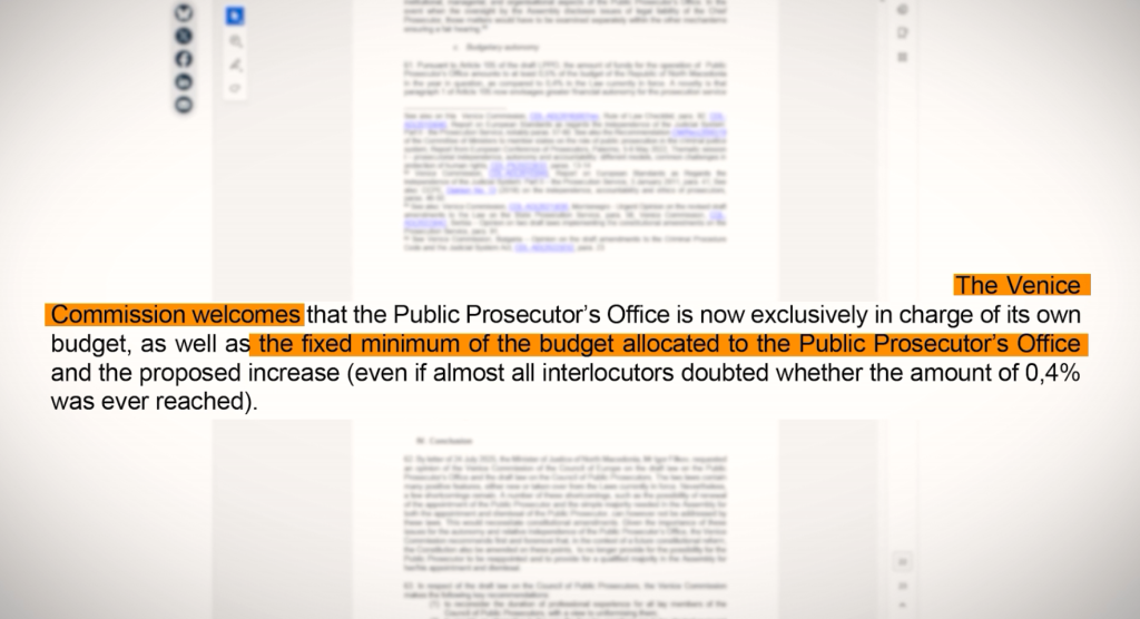 “Венецијанската комисија го поздравува… фиксниот минимум од буџетот доделен на Јавното обвинителство и предложеното зголемување“