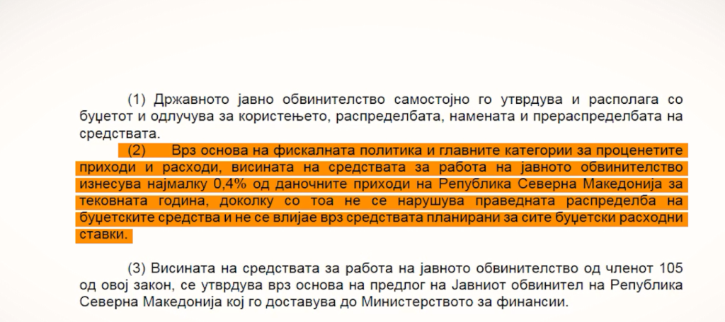 „Врз основа на фискалната политика и главните категории за проценетите приходи и расходи, висината на средствата за работа на јавното обвинителство изнесува најмалку 0,5% oд Буџетот на Република Северна Македонија за тековната година.“