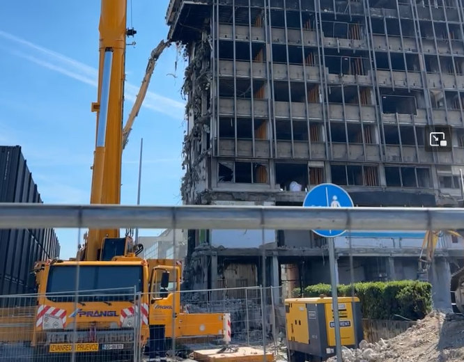 Денеска се отстрануваше четвртиот кат на северната страна од висококатницата, додека трите долни ката веќе се делумно отстранети. Со тоа, се врши постепеното рушење на зградата, кое почна кон крајот на март.