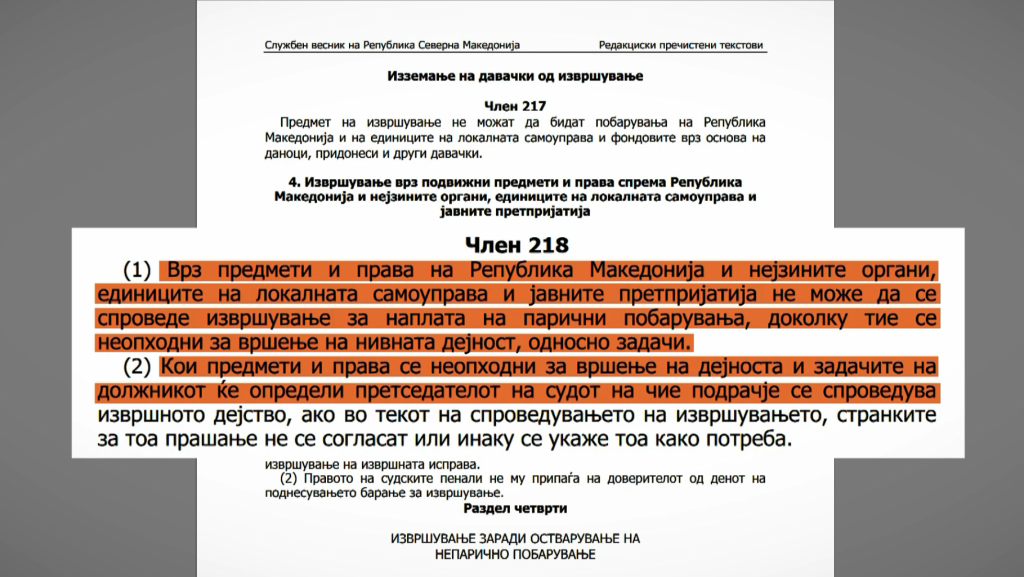 „Не значи дека извршувањето може да се спроведе и врз парични средства кои се неопходни за вршењето на дејност на Република Северна Македонија и нејзините органи, единиците на локалната самоуправа и јавните претпријатија и дека претседателот на судот на чие подрачје се спроведува извршувањето не е овластен согласно член 218 од Законот за извршување да определува кои средства се тие средства.“