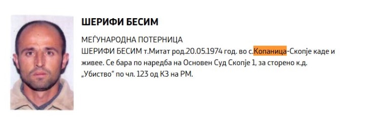 Но, според изворите, отпечатоците од прстите откриле дека лицето за кое станува збор е Бесим Шерифи. Убиството за кое е обвинет се случило на 5.10.2007 година во селото Копаница, Скопско, каде што биле убиени 3 лица. Судот наредил негово апсење во отсуство, што, според кривичното законодавство во Северна Македонија, предвидува доживотна казна затвор.