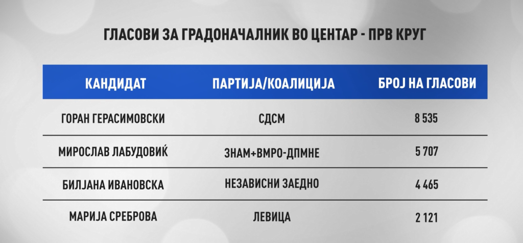 Ако се фрли поглед изолирано само на гласовите за градоначалник во Центар во првиот круг, очигледна е предноста на Горан Герасимовски од СДСМ со 8 535 гласа наспроти Мирослав Лабудовиќ од ЗНАМ кој освои 5 707. Но, останува прашањето на чие конто ќе завршат гласовите од двете кандидатки кои излегоа од трката – независната Билјана Ивановска која освои 4 465 гласа и кандидатката на Левица, Марија Среброва, која доби 2 121 глас.