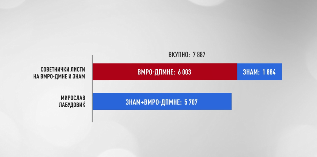 Во противничкиот табор пак, ЗНАМ и ВМРО-ДПМНЕ на купче имаат околу 7 800. Со оглед на тоа што ВМРО-ДПМНЕ нема кандидат и јавно кажаа дека ќе ги поддржат ЗНАМ, нејасно е зошто кандидатот Лабудовиќ во првиот круг имаше околу 5 700 гласа. Тој има околу 2 100 гласа кусок од ВМРО-ДПМНЕ и ЗНАМ за Советот.