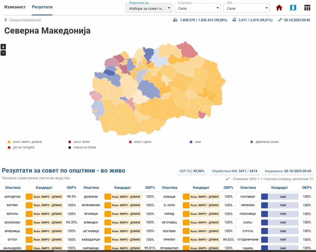 Инаку, станува збор за податоци добиени врз основа на обработени 3 471 избирачко место, од вкупно 3 474 или во проценти – 99,91 осто.