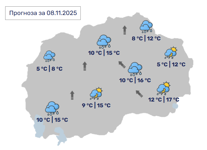 Во Скопје времето ќе биде променливо облачно со повремени врнежи од дожд и умерен до засилен југоисточен ветер. Минималната температура ќе се спушти до 10, а максималната ќе достигне до 16 степени.