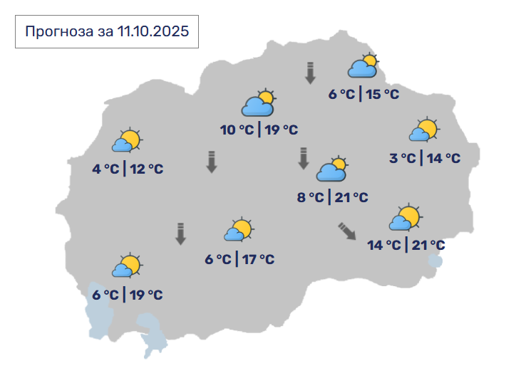 Минималните утрински температури ќе се движат од 4 до 12 степени, додека дневните ќе достигнат од 11 до 21 Целзиусов степен. Во Скопје се очекува слична временска состојба – променливо облачно со сончеви периоди и умерен до повремено засилен северен ветер. Минималната температура ќе биде околу 11 степени, а максималната ќе достигне 19 степени.