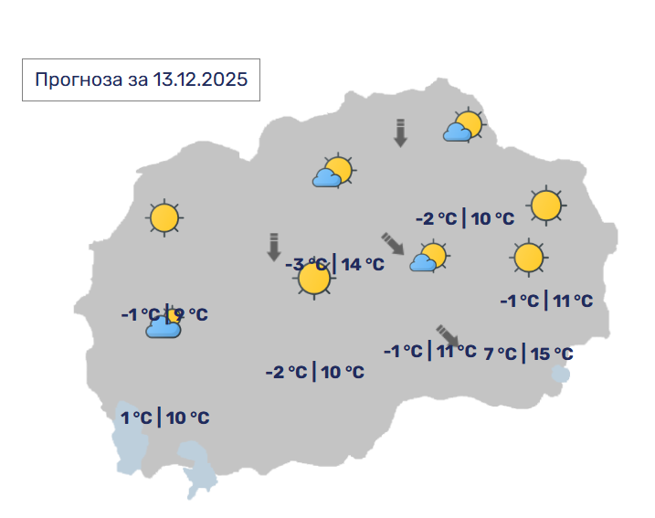 Во Скопје, претпладне е можна појава на магла во делови од котлината. Потоа ќе преовладува сончево и тивко време со мала до умерена облачност. Температурите ќе се движат од –2 степена во утринските часови, до максимални 11 степени преку ден.