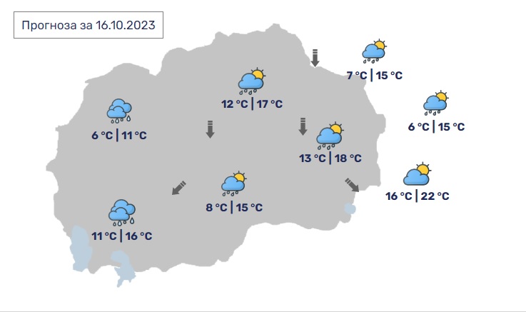 Времето денеска во претпладневните часови ќе биде облачно со локални врнежи од дожд, а попладне се очекува врнежите да престанат и да биде променливо облачно и свежо. Ќе дува умерен до засилен ветер од северен правец, најизразен вдолж Повардарието, информираат од Управата за хидрометеоролошки работи (УХМР). Температурите наутро ќе бидат од 6 до 16 Целзиусови степени, а во попладневните часови од 11 до 22 Целзиусови степени.