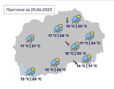 Локално процесите ќе бидат поинтензивни во форма на невреме проследени со обилен пороен дожд за кратко време, електрични празнења, силен ветер и изолирана појава на град. UV=6, објави Управата за хидрометеоролошки работи (УХМР).