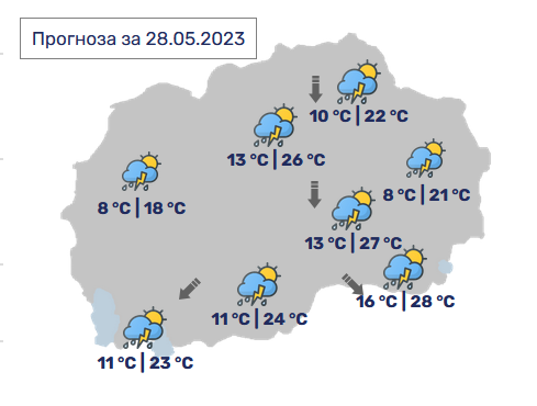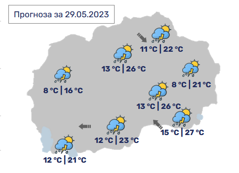 Продолжува периодот на променливо облачно и топло време. Во попладневните часови ќе биде нестабилно со локален пороен дожд, грмежи и засилен ветер. На места процесите ќе бидат во форма на краткотрајно невреме со поинтензивен дожд, силен ветер и изолирана појава на град, најавува УХМР