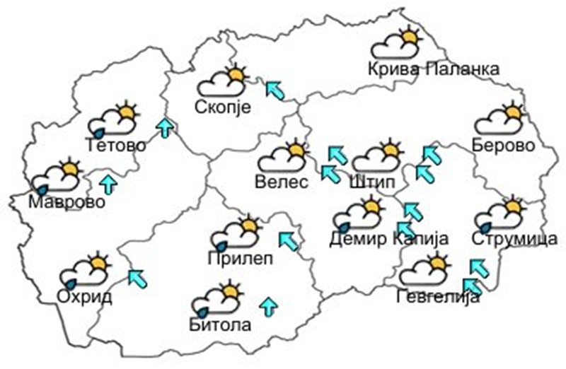 Во Скопје, според синоптичарите, се очекува слилно време, променливо облачно со умерен до засилен ветер од јужен правец. Дневната температура во главниот град ќе се искачи до 20 Целзиусови степени.