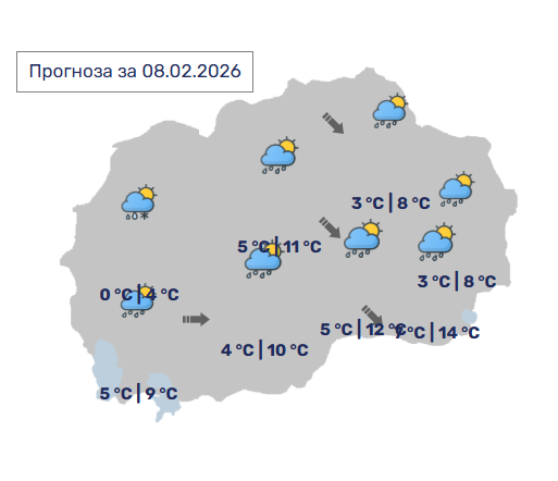 Во Скопје времето ќе биде променливо облачно со повремени врнежи од дожд. Ќе дува слаб до умерен ветер од северозападен правец. Минималната температура ќе се спушти до 5, а максималната ќе достигне до 11 степени.