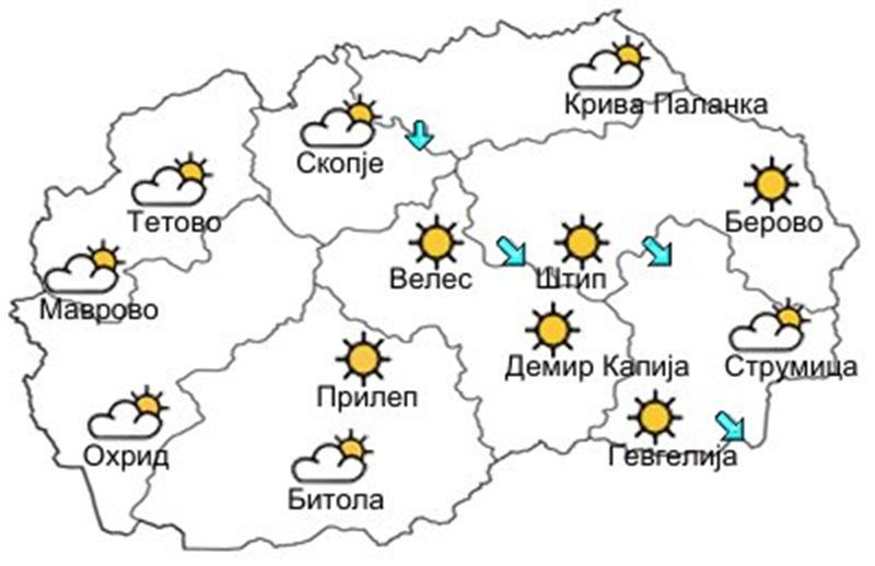Денеска времето во земјава ќе биде сончево и топло со мала до умерена локална облачност, се вели во прогнозата на Управата за хидрометеоролошки работи (УХМР). Ќе дува слаб до умерен ветер од северен правец.