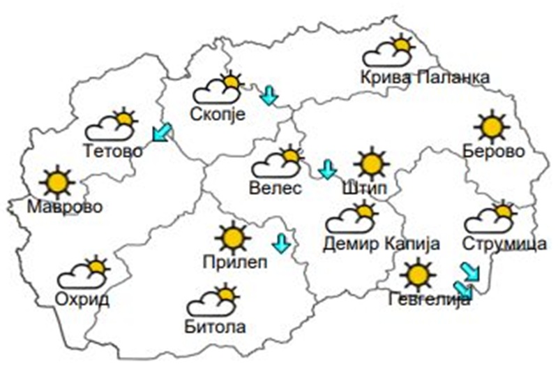 Во Скопје, претпладне во делови од котлината ќе има услови за појава на слаба магла, а во текот на денот, според синоптичарите, ќе биде сончево со мала до умерена облачност и слаб до умерен ветер од северен правец. Дневната температура во главниот град ќе се искачи до 12 Целзиусови степени.