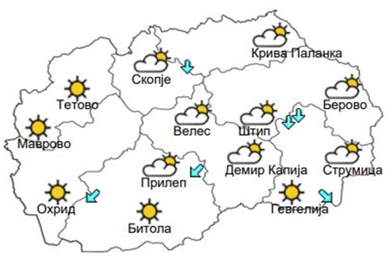Денеска времето во земјава ќе биде сончево со мала до умерена облачност, велат од Управата за хидрометеролошки работи (УХМР). Ќе дува слаб до умерен ветер од северен правец, кој наместа долж Повардарието повремено ќе биде засилен, особено во претпладневните часови.