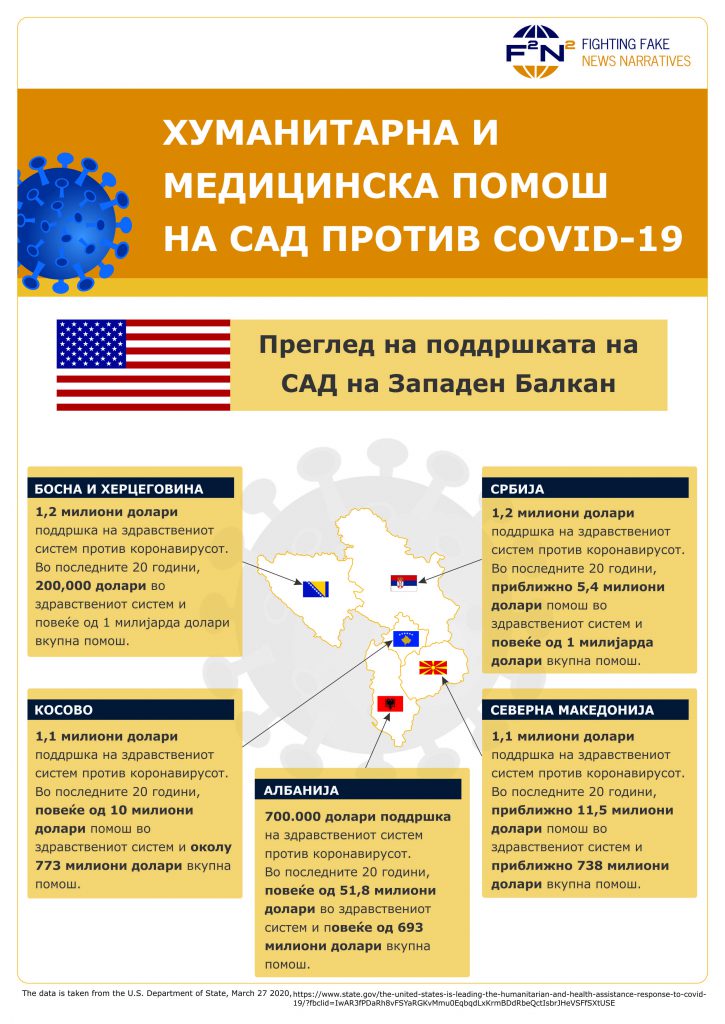 Според инфо-графикот што го изработи „Ф2Н2“ за американската помош испратена до Западен Балкан се гледа дека во последниве 20 години, само во секторот здравство, од САД се пристигнати донации од приближно 11,5 милиони долари.