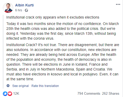 „Денеска се навршија два месеца од изгласувањето недоверба. На 25 март на здравствената се надодаде и политичка криза. Меѓутоа ние се изборуваме. Вчера беше првиот ден, од 13 март, без заразени од коронавирусот. Институционален грч? Не е вистина. Несогласувања има, но има и решение. Согласно нашиот Устав, потребни се нови избори. Тие веќе се одржуваат низ Европа. (…) Избори ќе има во јуни во Исланд, Франција и Србија, додека во јули во Северна Македонија, Шпанија и Хрватска. Треба да имаме (парламентарни) избори и ние во Косово, а и локални во Подујево. Дури, може и во исто време“,